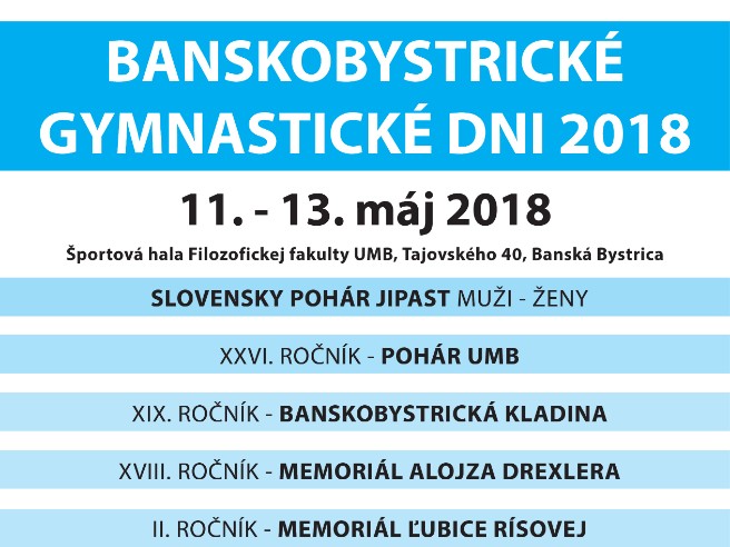 Cez víkend pozývame všetkých priaznivcov gymnastiky do Banskej Bystrice, kde v rámci Banskobystrických gymnastických dní 2018 sa v športovej hale Filozofickej fakulty UMB budú konať aj preteky Slovenského pohára Jipast v športovej gymnastike mužov a žien.V rámci gymnastických dní sa uskutočnia tiež aj preteky Pohára UMB, Banskobystrickej kladiny, memoriál Alojza Drexlera a memoriál Ľubice Rísovej.