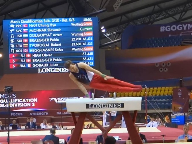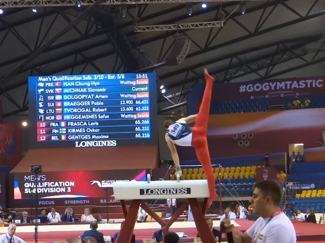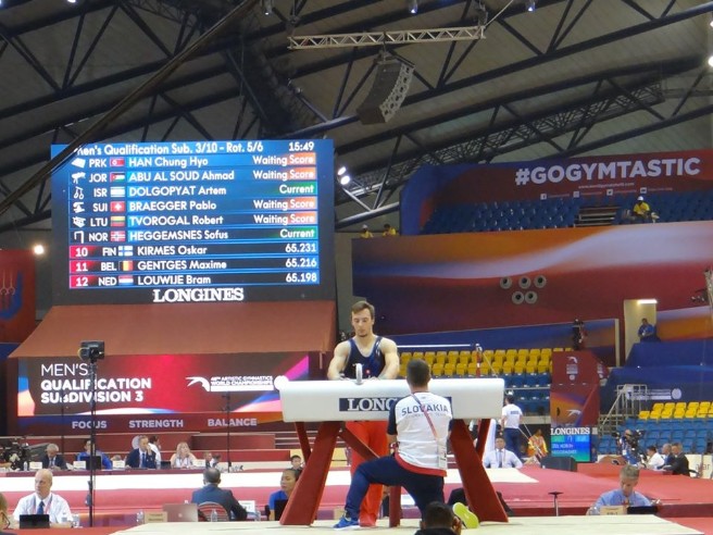 Svoje vystúpenie začal na preskoku, kde skok „Jurčenko s obratom o 360 st.“ predviedol veľmi dobre. Žiaľ na bradlách sa dopustil hrubej chyby pri náročnom cvičebnom tvare „Heyly“ čo sa odrazilo na nižšej známke. Dobrý štandardný výkon podal na hrazde i na akrobacii, obe náradia bez väčšej chyby.