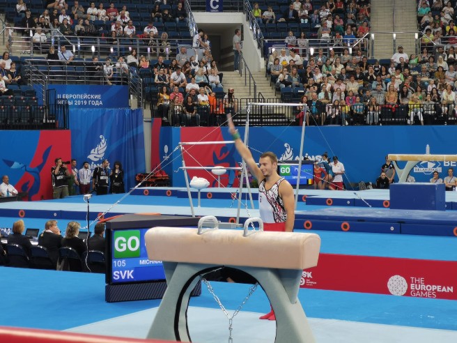 Náš seniorský reprezentant v športovej gymnastike mužov Slavomír Michňák na 2. Európskych hrách v Minsku včera, 27.6.2019 v kvalifikácii na koni na šírku predviedol veľmi kvalitnú zostavu, ktorá mu zabezpečila s výslednou známkou 14,40 boda postup do finále na tomto náradí.