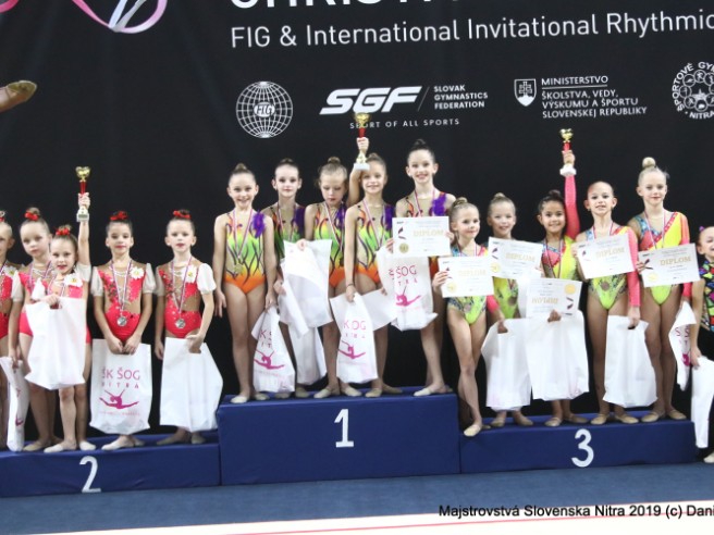 MLADŠIE NÁDEJE: 1. TJ Sokol Bratislava I. Vinohrady (Xénia Benkovitsová, Anabel Humanová, Nina Ďurinová, Karolína Ukropcová, Veronika Ivanová, Liana Janegová) 24,300 - 11,500 + 12,800, 2. ŠK ŠOG Nitra (Nina Sýkorová, Sophia Skačanová, Vivien Vrábelová, Alexandra Privalincová, Paula Šošková) 18,300 - 8,600 + 9,700, 3. Rapid (Natália Gašparová, Sofia Buglaková, Nina Cillingová, Hana Ružičková, Ema Vláčilová) 15,800 - 6,800 + 9,000