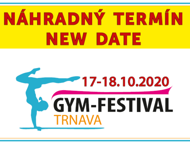 Vážení športoví priatelia, z dôvodu súčasnej situácie a neustáleho šírenia ochorenia COVID-19 a s ním spojených obmedzení Slovenská gymnastická federácia PREKLADÁ pôvodne plánovaný termín (12.-14.6.2020) medzinárodných majstrovstiev Slovenska v ŠG žien - GYM FESTIVAL Trnava 2020 na náhradný – nový termín : 17. – 18.10.2020 !