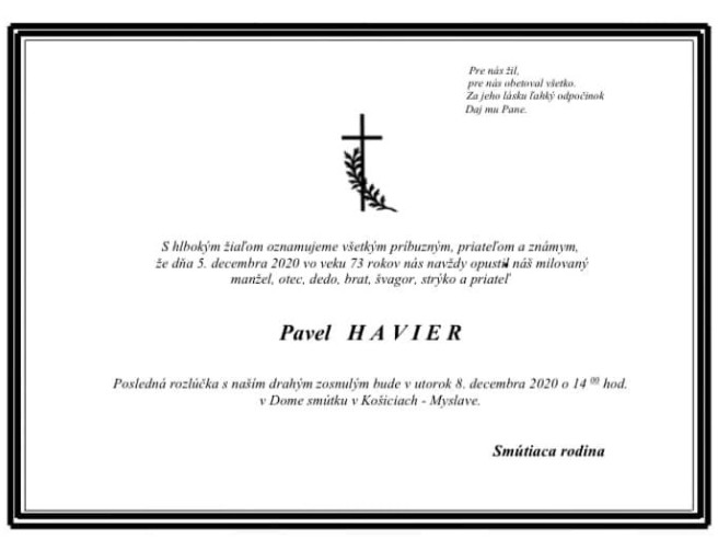 Posledná rozlúčka bude v utorok, 8.12.2020 o 14,00 hod v Dome smútku v Košiciach - Myslave.