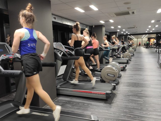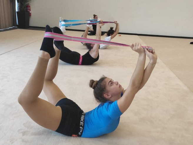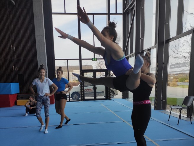 „V nedeľu bol program veľmi pestrý. Dopoludnie sme strávili v perfektne vybavenej gymnastickej hale a tréning vo viacerých blokoch sme venovali nácviku a zdokonaľovaniu rôznych cvičebných tvarov skupiny A, B, C , ktoré v športovom aerobiku predstavujú predovšetkým uplatnenie, statickej, dynamickej a výbušnej sily. V druhej fáze tréningu dievčatá postupne prenikali do tajov modifikovanej baletnej prípravy a cvičení Pilates. Na záver dňa trénerky pripravili zaujímavý intervalový aeróbny program s využitím kardio-trenažérov, ktorý plnil funkciu aktívnej regenerácie."