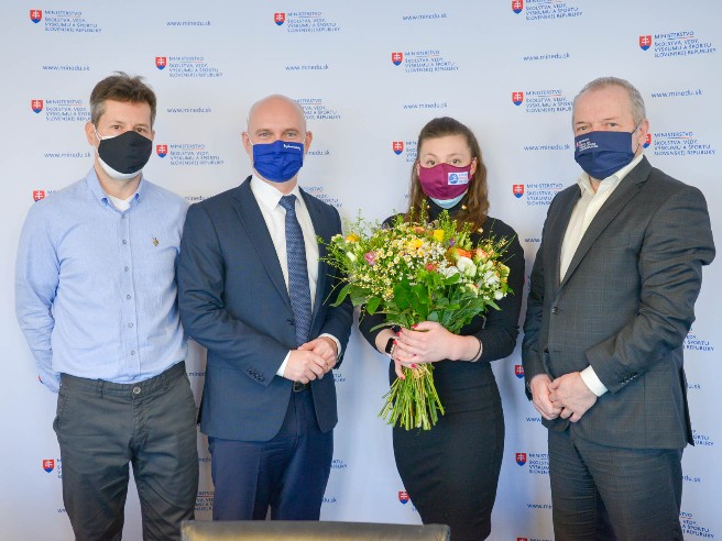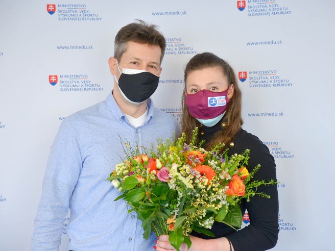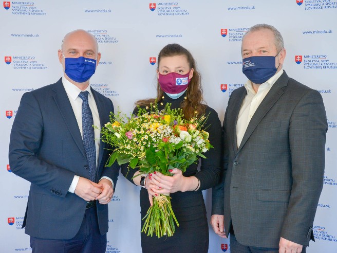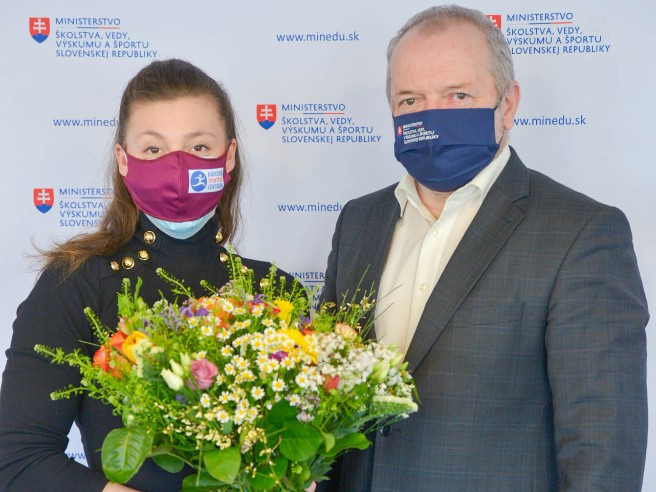 Naša súčasne najlepšia športová gymnastka dostala z rúk štátneho tajomníka MŠVVaŠ SR pre šport Ivana Husára a ministra školstva Branislava Gröhlinga krásnu kyticu a poďakovanie za vzornú reprezentáciu Slovenska na majstrovstvách Európy v tureckom Mersine koncom minulého roka.